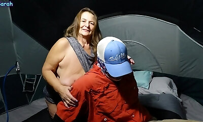 Short haired mature granny gives a filthy blowjob POV outdoors