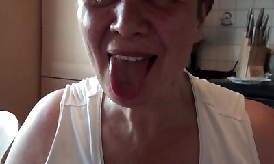 Insatiable, towheaded grandma is playing with her tits and her lovers dick, in the kitchen